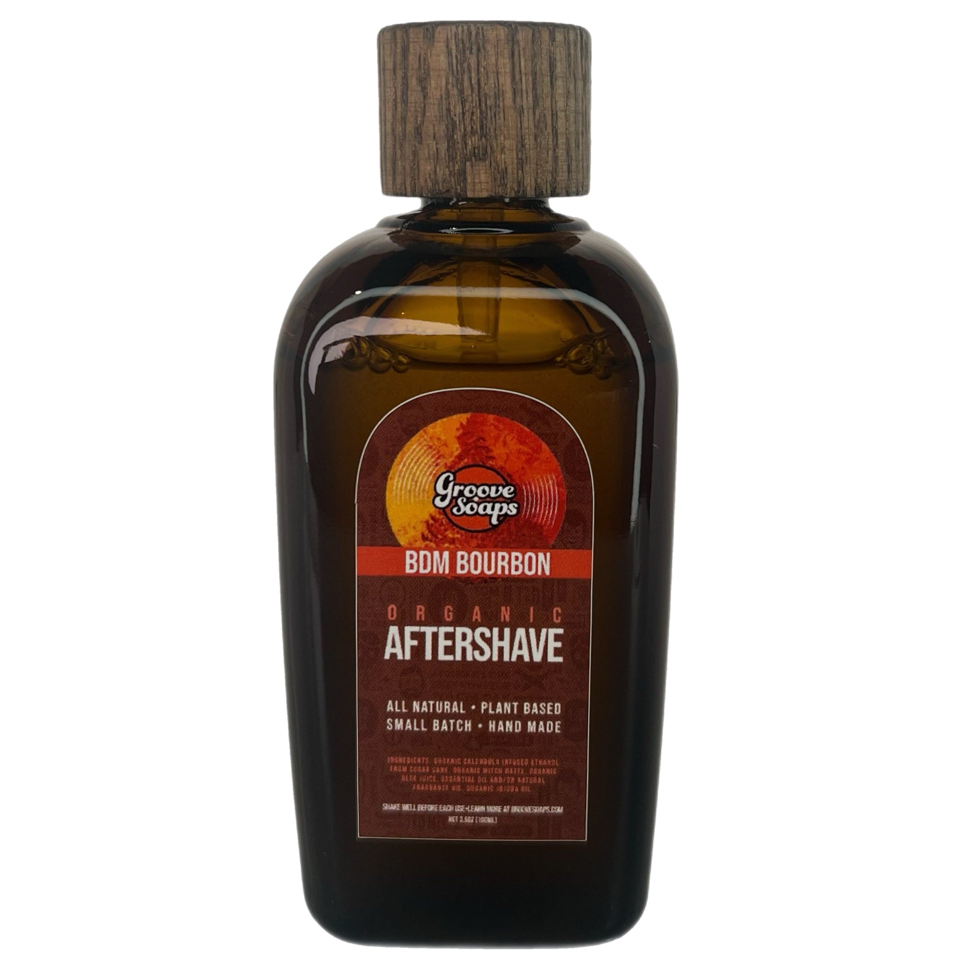 3.5oz handmade organic ethanol based aftershave in a recycled glass bottle with bamboo accents and a diffuser.