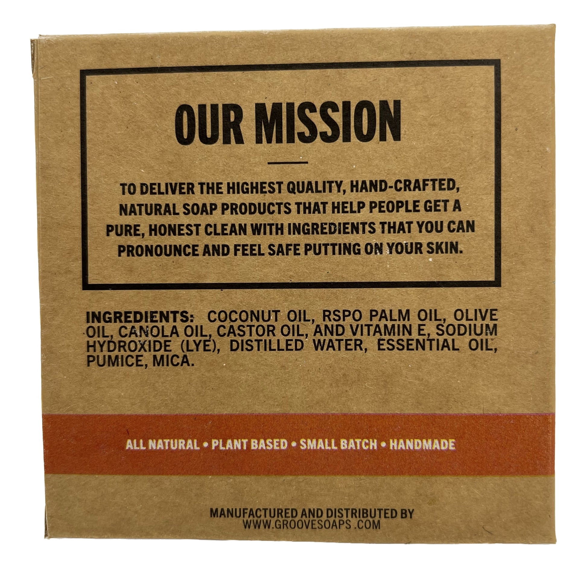 Coconut oil, RSPO Palm oil, Olive oil, Canola oil, Castor oil, and Vitamin E, Sodium Hydroxide (Lye), Distilled Water, Essential Oil, Pumice, Mica.
