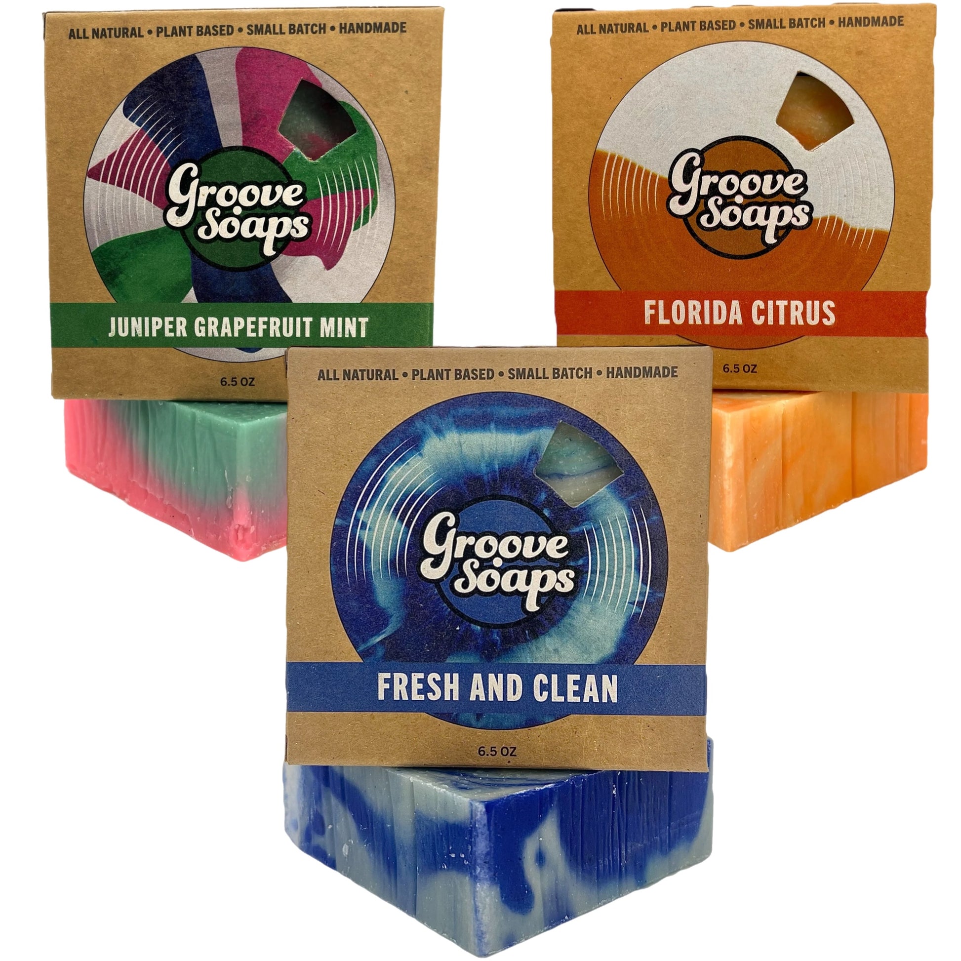 Three of our most refreshing and crisp 6.5oz handmade plant-based soap bars. Cut with guitar strings, hand stamped and in a fully compostable box.