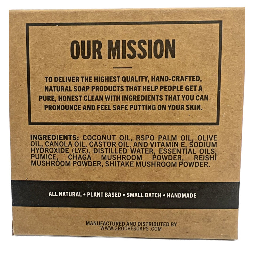 Coconut oil, RSPO Palm oil, Olive oil, Canola oil, Castor oil, and Vitamin E, Sodium Hydroxide (Lye), Distilled Water, Essential Oils, Pumice, Organic Chaga Mushroom Powder, Organic Reishi Mushroom Powder, Organic Shitake Mushroom Powder.