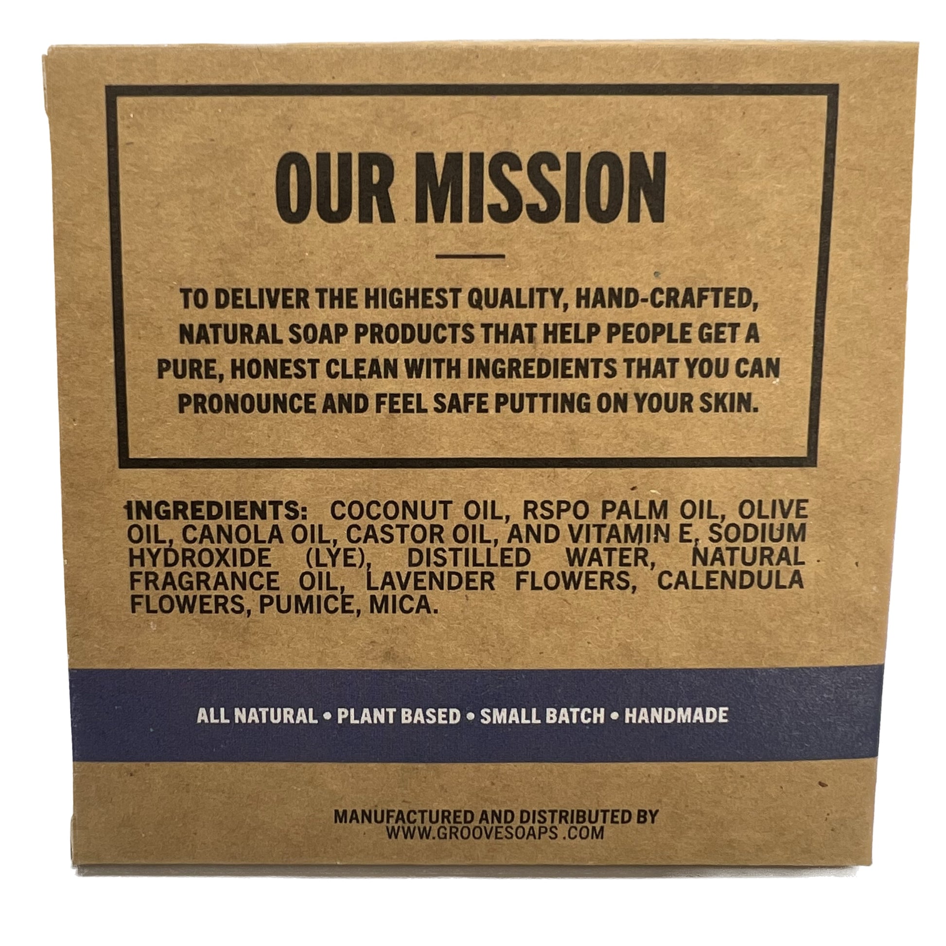 Coconut oil, RSPO Palm Oil, Olive Oil, Canola Oil, Castor oil, and Vitamin E, Sodium Hydroxide (Lye), Distilled Water, Natural Fragrance Oil, Organic Lavender Flowers, Organic Calendula Flowers, Pumice, Mica.