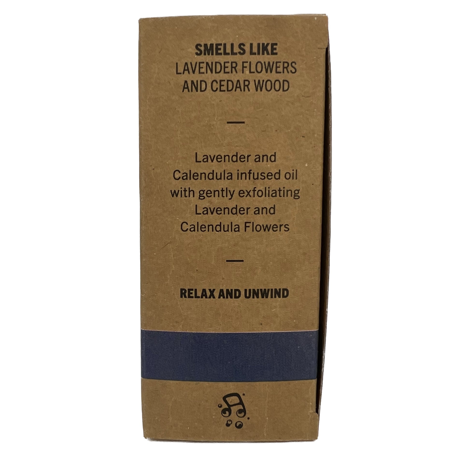 Lavender and Calendula infused oil with gently exfoliating Lavender and Calendula flowers.  Relax and unwind.