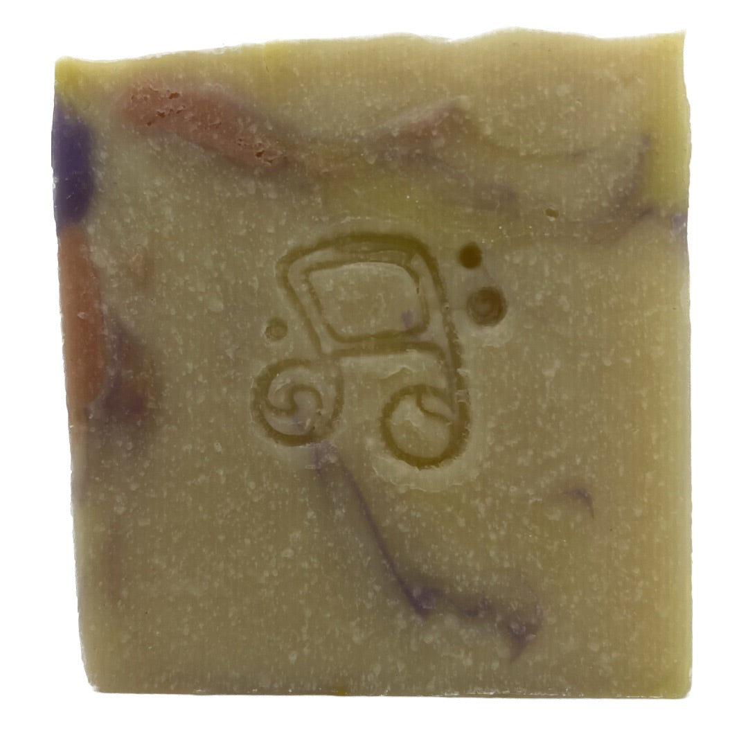 6.5oz handmade plant based soap bar cut with guitar strings in a fully compostable box.