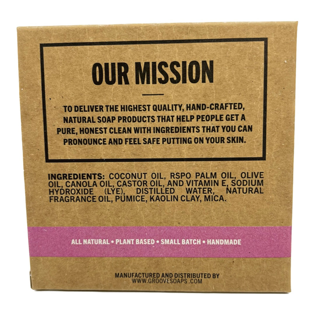Coconut oil, RSPO Palm oil, Olive oil, Canola oil, Castor oil, and Vitamin E, Sodium Hydroxide (Lye), Distilled Water, Natural Fragrance Oil, Pumice, Pink Kaolin Clay, Mica.